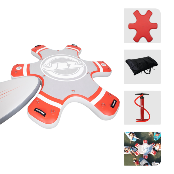 Con l’isola gonfiabile Jflow, grazie alla specifica forma a “fiore” è possibile assicurare fino a SUP contemporaneamente alla piattaforma, in modo circolare, tramite gli anelli a D, rendendo così più facile eseguire e coordinare le attività di gruppo.